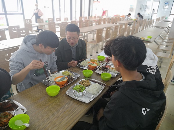 就餐过程中,陈云志和沈音乐与同学们展开亲切交流,不仅畅聊平时的生活学习,也就老员工普遍关心的问题进行了深刻交流。同学们也借此机会,向老师们提出了很多在校生活中碰到的问题,比如食堂高峰排队时间比较长,菜品种类不丰富等。老师们积极倾听同学们的心声,也利用此次共进午餐的机会对相关问题作了回答。同时,老师们进一步了解了同学们在学习方面和在宿舍内的生活情况,并对同学们提出了希望。就餐期间,氛围轻松、愉快、热烈、融洽。
