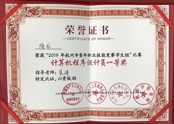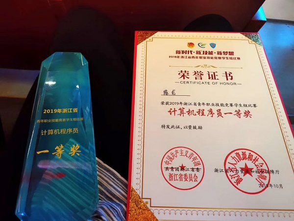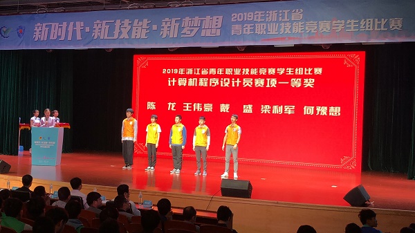9月20日至21日,2019年杭州市青年职业技能竞赛员工组比赛在杭州第一技师学院举行,软件技术专业员工陈龙获得“计算机程序员”赛项一等奖,梁利军、王伟豪、尤真豪获得二等奖,戴盛同学获得三等奖。
