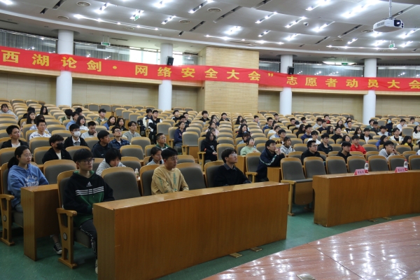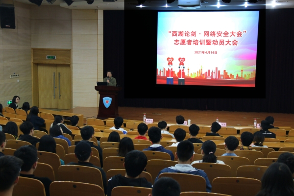 为做好“西湖论剑·网络安全大会”志愿服务的准备工作,保障大会志愿服务水平,4月14日下午,信工院在行政楼报告厅召开“西湖论剑·网络安全大会”志愿者培训暨动员大会,杭州安恒信息技术股份有限公司网络安全学院行政总监许玉洁、信工院经理陈云志、信工院学工办主任章春军出席,团总支负责人王璐瑜主持大会。