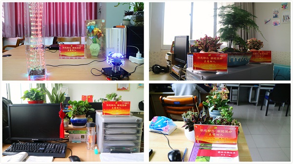 围绕活动主题,老师们齐心协力的开展了卫生清洁活动,并用展出教学成果、张挂个人书画作品、点缀清新绿植等方式进行办公室的装点布置。 “立德树人”桌牌亮出了教师的身份,座右铭体现了老师们的教育理念,桌牌背面刻印的 “四有好老师”、“四个引路人”、“四个相统一”以及信工党建“三先做”,时刻提醒着每位教职工牢记习近平总书记提出的“坚持办学正确政治方向”的要求以及“为中国特色社会主义事业培养合格建设者和可靠接班人”的初心。每个专业和每个党支部各派1名员工代表组成员工9人考评团,走进一个个办公室,对老师们精心布置的成果进行认真打分,充分感受到老师们以率先垂范的方式带动同学们建设好自己寝室家园的引领力。