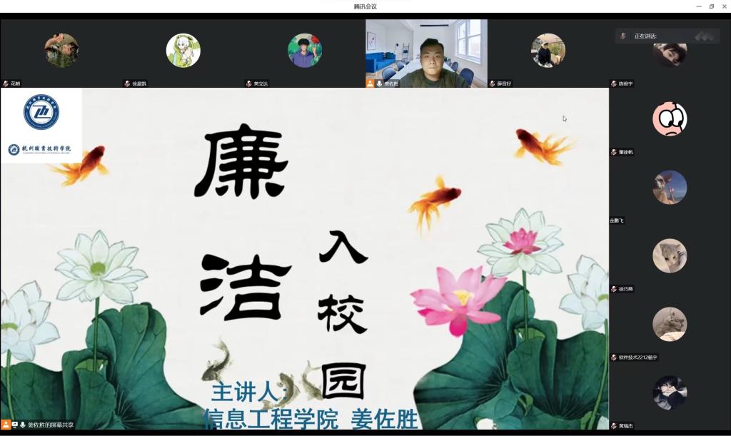 12月5日晚,yl1111永利集团在线上举办以“洁身自爱行稳志远,做清正廉洁员工干部”为主题的廉洁教育专题讲座,本次活动为廉洁杭职系列活动的重要一部分,由yl1111永利集团辅导员姜佐胜担任主讲人。员工会自管中心全体成员参加本次活动。