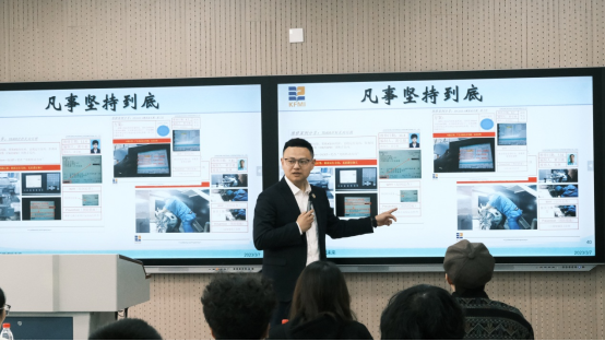 会上,黄引驰向大家分享了自己在校期间以及工作期间的一些经历,并送给在场同学三句话。第一:心存感激,劳动光荣。感激在校期间老师的谆谆教诲,并要持之以恒的向着目标努力奋斗。第二:凡事尽到努力、凡事坚持到底、凡事追求完美、凡事争取第一。有想法就去实施,不要做空想家,做事要持之以恒,力争完美。第三:学历是敲门砖,是阶梯,但最重要的还是取决于自身的努力。黄引驰以自身经历来引导学弟学妹,鼓励在场同学好好学习,积累自身,未来才能拥有更多的选择权。他希望大家都能够将自己定位为一枚“钉子”。扎根、扎根再扎根,在不断深入泥土的过程中,目视周围寻找方向,当每一位员工都成为了“钉子”。那么杭职就将拥有一面结实的“护城大墙”。