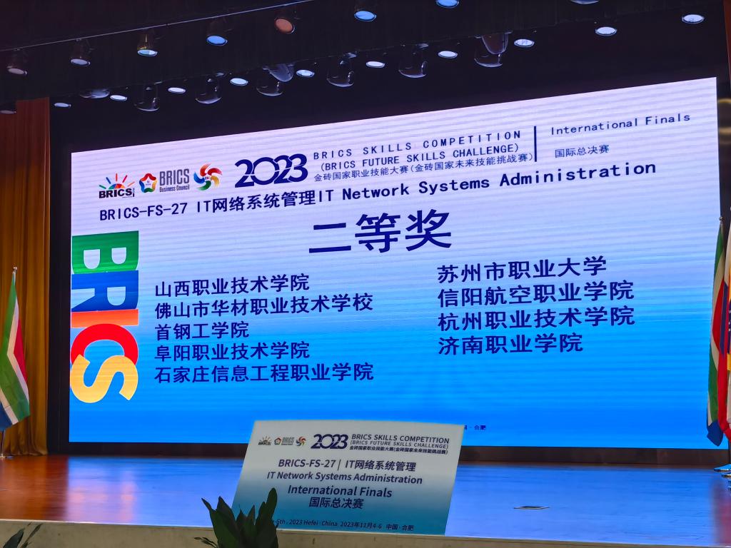 11月6日,2023金砖国家职业技能大赛之IT网络系统管理赛项国际总决赛在安徽城市管理职业学院落下帷幕,yl1111永利集团信息安全技术应用专业员工胡金龙、王妍博在申毅、赵刚两位老师的指导下,获得了全国二等奖的好成绩。