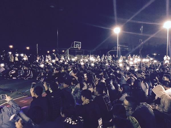 歌会现场,同学们热情高涨,在夜色中挥动手机闪光灯照亮整个会场,将篮球场变成了欢乐的海洋。伴随着信工院员工会助理们的开场秀,傅立军老师致开场词后,晚会正式开始。每个新生班推选的歌唱节目一个比一个精彩,表演者们在台上一展歌喉,动听的歌声令人流连忘返。在期间安排的小游戏互动环节,更是拉近了信工院与彩虹鱼康复护理学院员工之间的距离,伴随越发精彩的节目,活动现场高潮不断,尖叫声欢呼声此起彼伏。