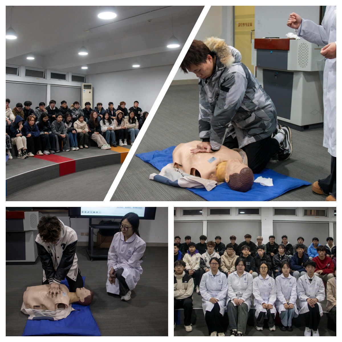 培训以"理论+实操"双轨模式展开。彩虹鱼学院的讲师通过真实案例与急救视频,系统讲解心肺复苏、海姆立克急救法等核心技能,强调"黄金救援时间"的重要性。学员认真记录要点,并围绕常见急救场景展开讨论。