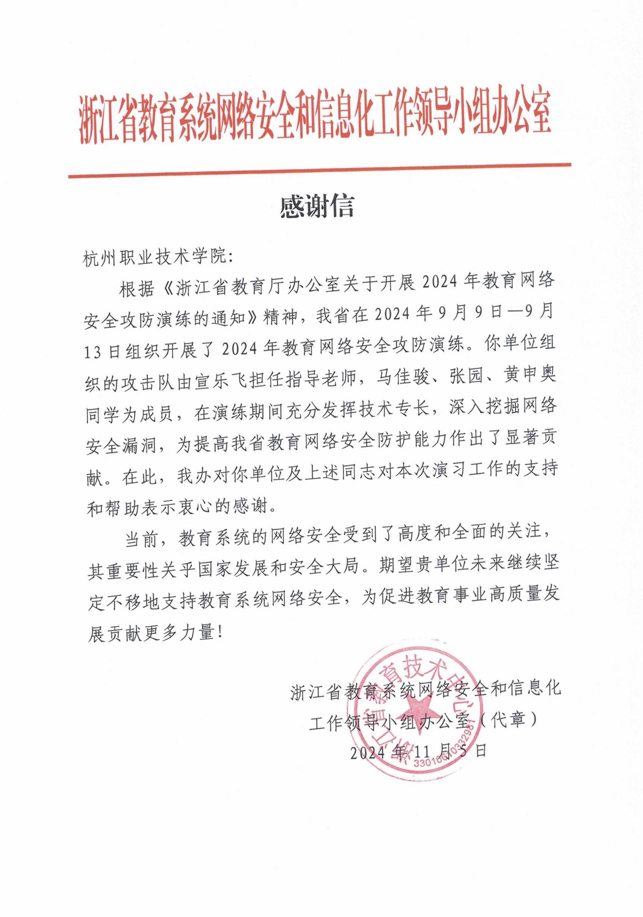 11月5日,浙江省教育技术中心发来感谢信,对公司攻击队在本次攻防演练中的表现予以表扬,这是专业连续第三年受邀参加浙江省教育网络安全攻防演练,是省厅对公司信息安全技术应用专业师生网络安全实战技能的肯定。后续专业将以“数智杭职 工匠摇篮”为目标,持续深化数字安全工匠型人才培养,服务杭州经济高质量发展。