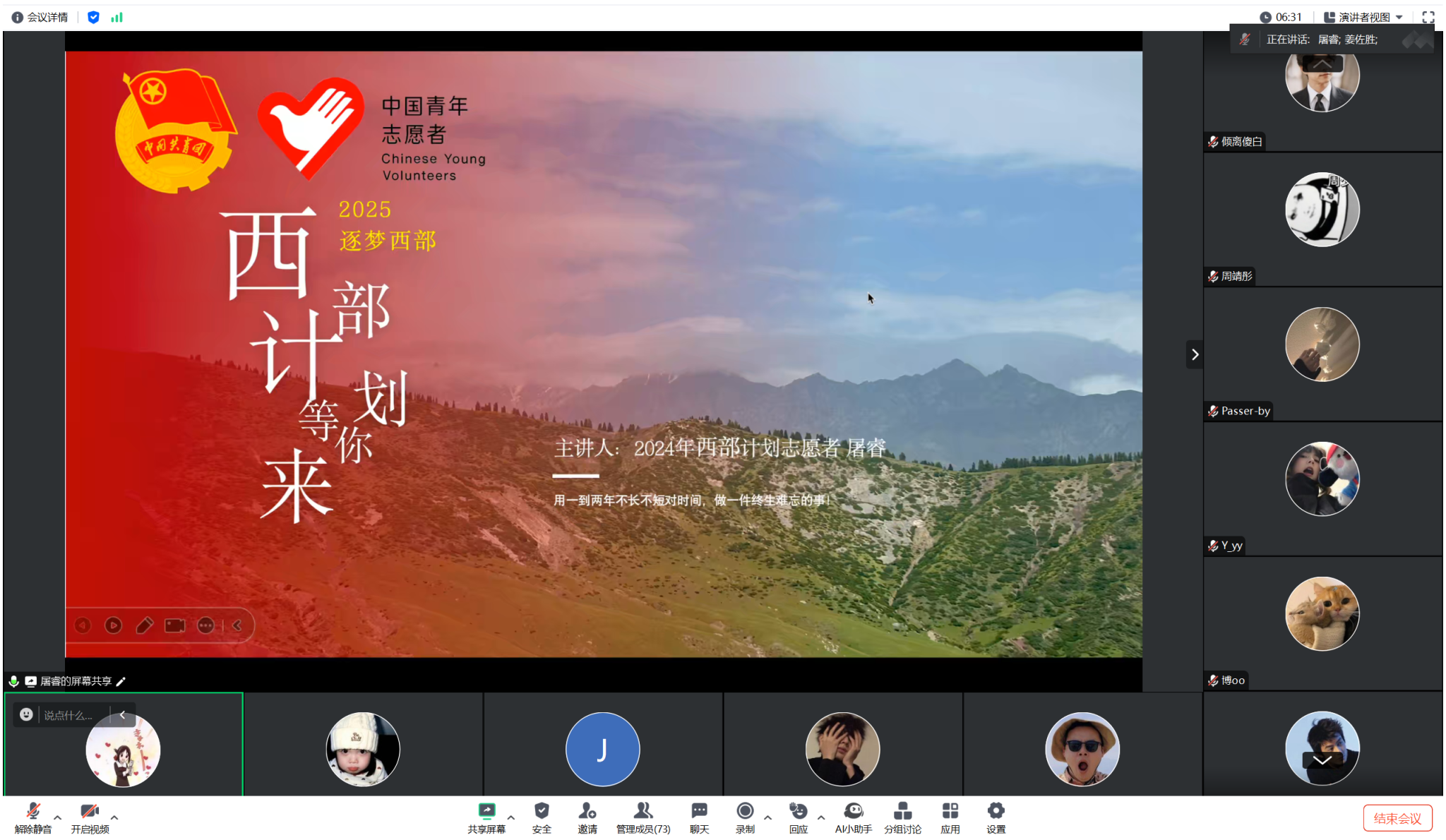 宣讲会现场连线了两名学院2024届物联网专业毕业生、现服务于“西部计划”的屠睿和周俊。现任新疆维吾尔自治区阿克苏地区温宿县团委青发部干事的屠睿生动阐述了“西部计划”的服务内容,讲述了自己从初到新疆时的不适应,到逐渐融入当地生活,一年来深刻感受到了“西部计划”的魅力与价值。