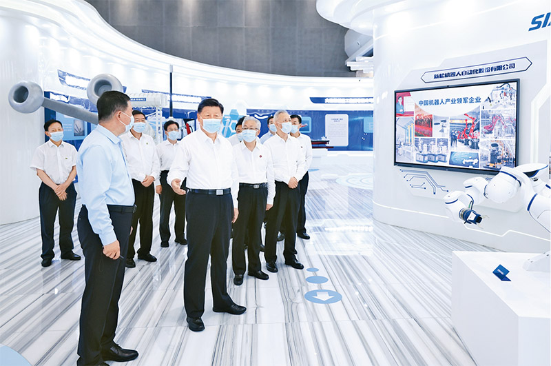 2022年8月16日至17日,中共中央总书记、国家主席、中央军委主席习近平在辽宁考察。这是17日下午,习近平在沈阳新松机器人自动化股份有限公司展厅,了解公司生产经营、自主创新情况。